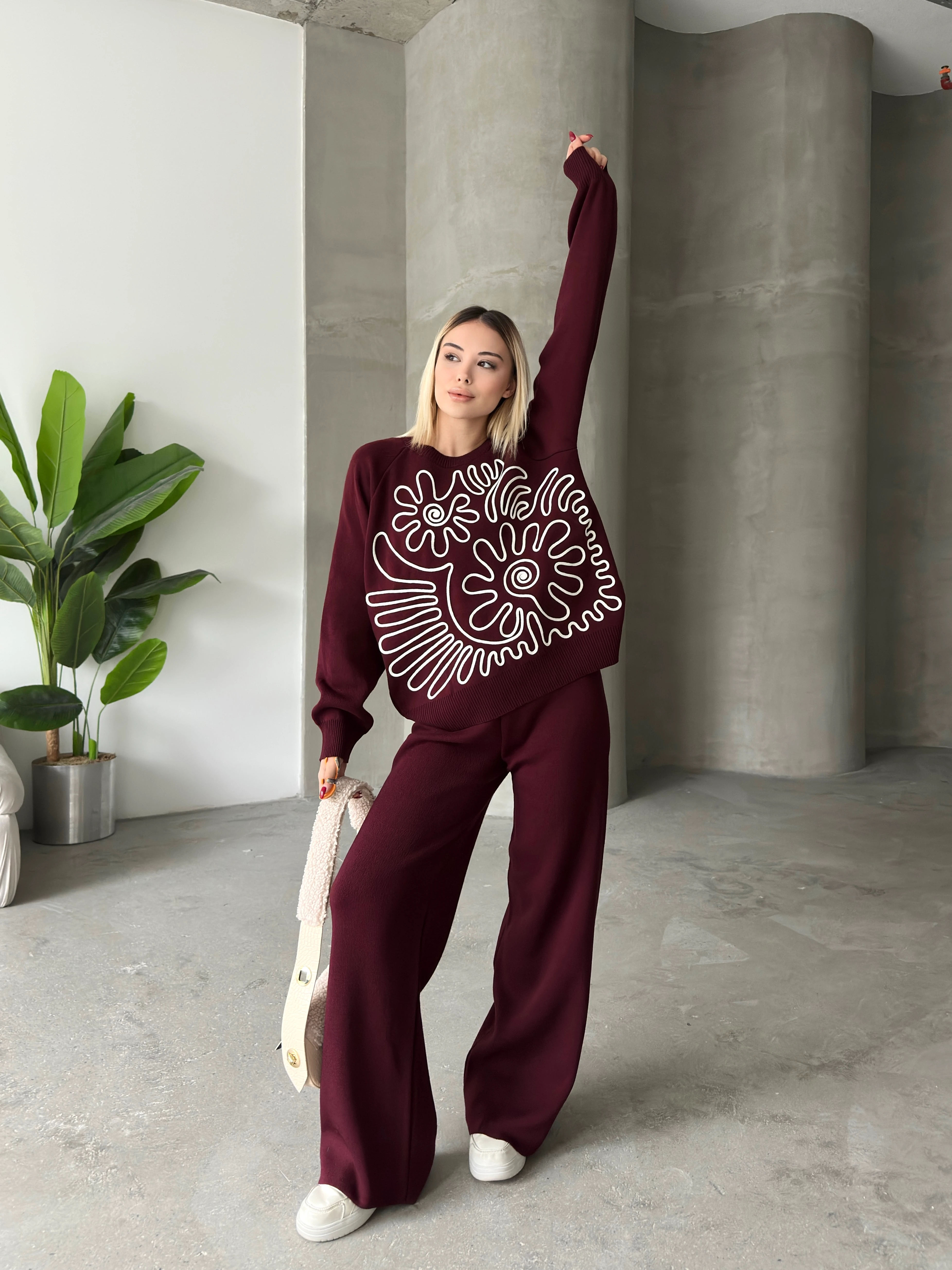 Dökümlü Uzun Hırka Pantolon Takım - Bordo